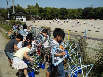 生活科で観察しているミニトマトの鉢に支柱をつけました。これで横に伸びていっているミニトマトの茎が支柱にからみ,観察しやすくなります。