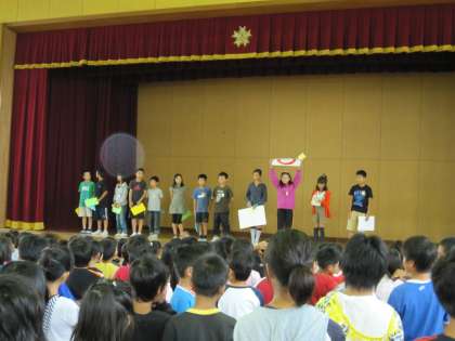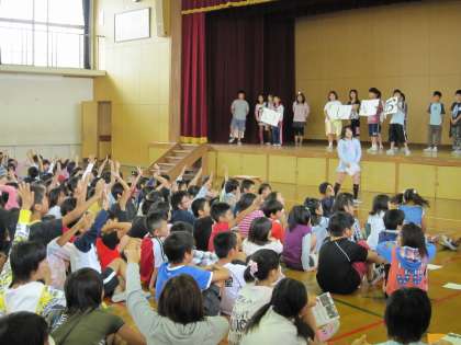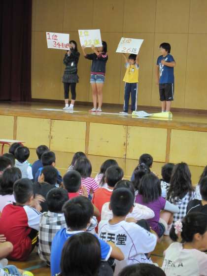 飼育委員会からは,「ウサギはクローバーを食べますか。」というようなうさぎについての○×クイズをしました。みんな楽しそうに応えていました。そのあと「ラビットラリー」の結果発表をしました。