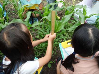 今日は算数の学習で勉強した30センチものさしを使って観察しました。1番大きなもので55センチくらいありました。隣の畑のポップコーンと比べ「色も濃く葉も大きいな」と2年生はとてもうれしそうでした。