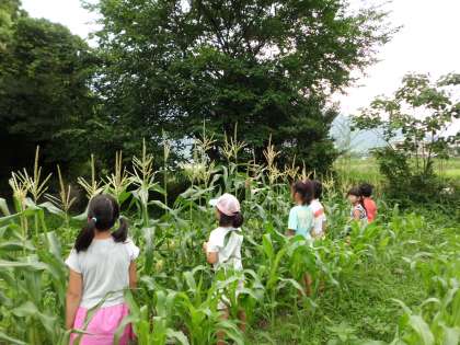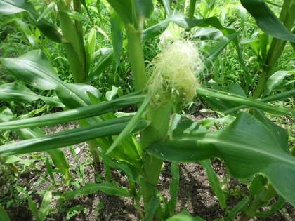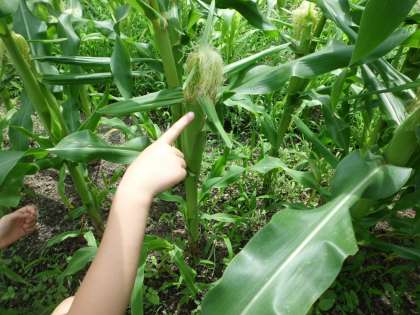 雨が降り,土日の間にスイートコーンがずいぶん大きくなりました。今日は草取りをしました。大きくなったスイートコーンの茎に目をやると,実ができていることに気が付きました。