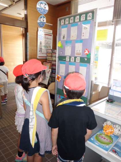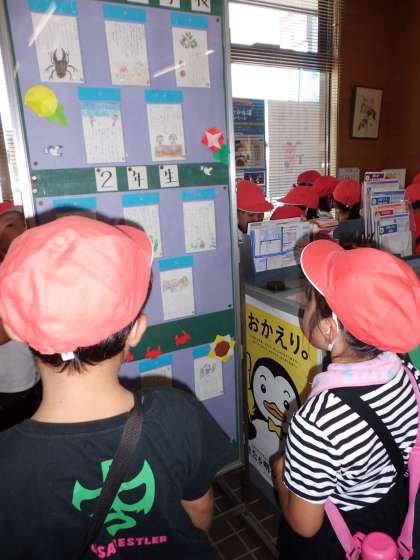 大原野灰方郵便局の取り組みの一つで,2年生が「夏のおたより」を書きました。書いた作品を大原野灰方郵便局に展示していただいています。そこで,郵便局に行き見てきました。自分の葉書をみつけると「あった。」と喜んでいました。子ども達の作品をすてきに飾っていただきました。