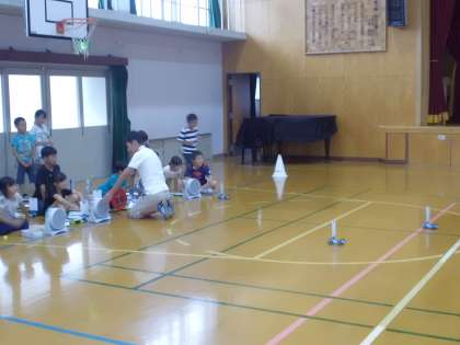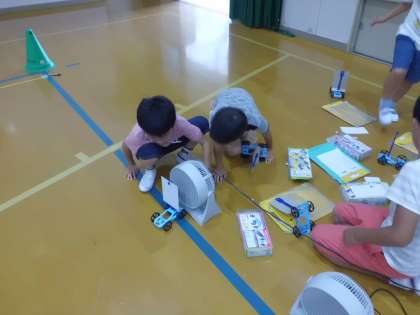理科の風のはたらきの学習でキッドを使って実験をしました。強い風と弱い風では車の進む距離はどう変わるかを実験しました。自分の経験から予想をたて,実際にやってみてさらに子どもたちの考えが深まったと思います。