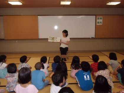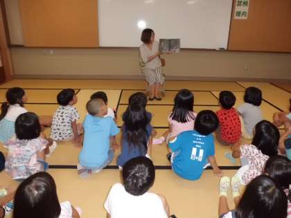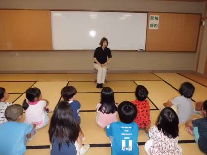 7月も,おはなしでてこいをしていただきました。図書館がビフォーアフター中ために,大原やで行っていただきました。詩・素話・絵本・ゲーム・英語の絵本といつものようにもりだくさんで,楽しいひとときを過ごしました。