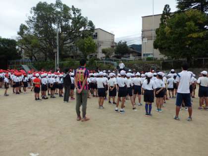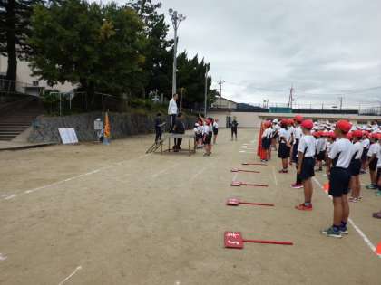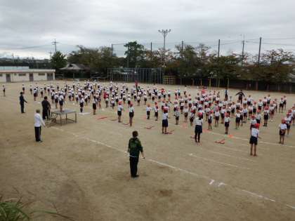 曇り空の中,全校で2回目の練習をしました。「昨日よりしっかり入退場ができています」と児童たちはほめてもらいました。プラカード係などの5・6年生も,運動場での動きに慣れてきました。応援団を中心に応援にも熱が入ってきています。14日の天候がやや心配ですが,どの学年もしっかり最後の仕上げにかかっています。児童には担任からも知らせますが,14日(土曜日)の天候が心配されますので,必ず学習の用意も待たせてください。お弁当もいります。