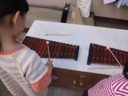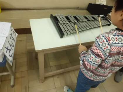 「きらきらぼし」を鍵盤ハーモニカや鉄琴,木琴を使って演奏しています。子ども達は鉄琴や木琴に興味津津で楽しく演奏していました。