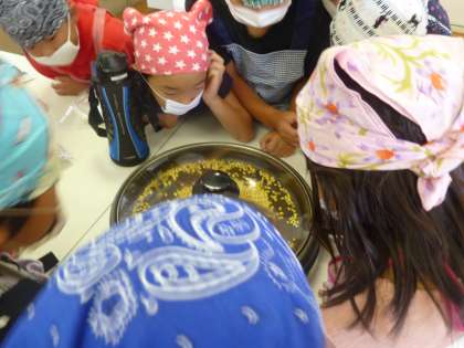 金曜日に運動会お疲れ様会としてポップコーンパーティーをしました。自分たちで育てたポップコーンを使いました。ポン!とはじける様子に子どもたちは大興奮!さらにみんなの絆が深まりました。