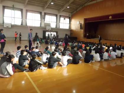 10月26日5時間目に避難訓練をしました。今日は学校に不審者が侵入しようとし,職員の退去の要請に応じなかったため,児童は安全な場所に避難するという想定で訓練を行いました。校長先生の避難指示で体育館に集まりました。教職員は不審者を少しでも児童に近づけないように,「さすまた」や「箒」を持って避難しました。体育館では校長先生と「お・は・し・も・て」と「い・か・の・お・す・し」の約束を一つ一つ確認しました。