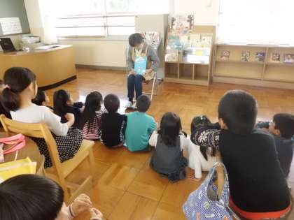 図書館に行って,学校司書の遠山先生に読み聞かせもしていただきました。図書館の中の色々な本を手にとって意欲的に本を読んでいました。
