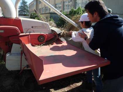 雨の影響で延期になった脱穀をやりました。5年生が地域の方に機械の使い方を教えていただきながら,まだ水分の多い泥状態の田でがんばりました。5年生のおかげで,餅つき大会で使う餅米が脱穀できました。また脱穀した後の藁(わら)はウサギの寝床になったり,しめ縄になったりするそうです。