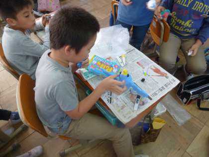 図工の時間にハッピー小物入れを作りました。紙粘土に色をつけて,びんに貼り付けていきました。一人一人個性あふれる小物入れができました♪