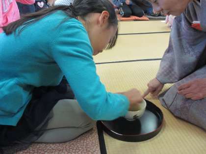 茶道の体験をしました。お茶のたて方や作法などを教えてもらいながら,一人ずつ体験することができました。とてもおいしかったようです。