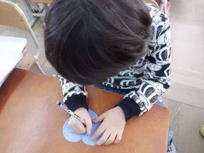 今回もだれかなとみんなわくわく。ハッピーキャロットがみつかると,歓声があがります。カードに感想を書いて小野先生に渡し,しおりをもらって喜ぶ子ども達です。