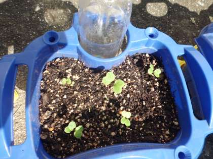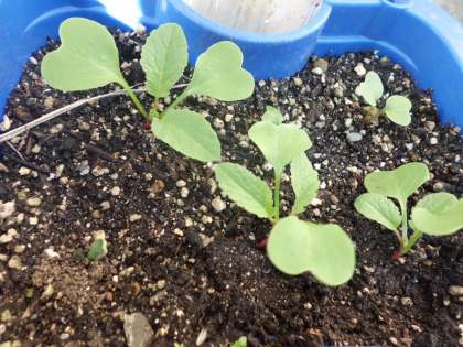 ハツカダイコンの芽が10日ほど前に出ました。今は本葉が出て大きくなってきました。大きくなって早く食べたいなと言っている2年生です。どのように大きくなるのか楽しみです。
