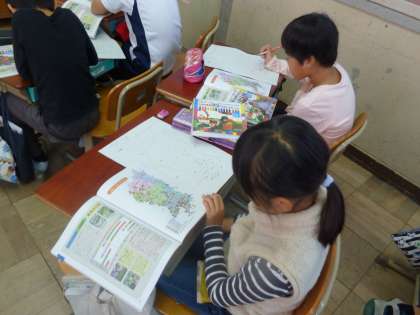 わたしたちの京都を見ながら,京都市でとれる農産物について白地図にまとめています。大原野の地域は竹の子や菜の花が有名なことを改めて感じた子どもたちです。そこからどういう所でどんなものがとれるのかを共有していきます。