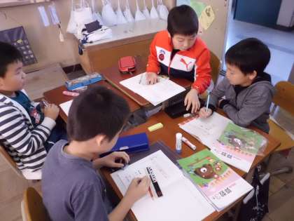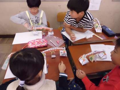 算数で「重さ」の学習をしています。子どもたちは班でどうしたら物の重さを比べられるかを考え,自分たちで作った天秤を使って確かめました。さらに正確に重さをはかるにはどうすればいいかこれから学習していきます。