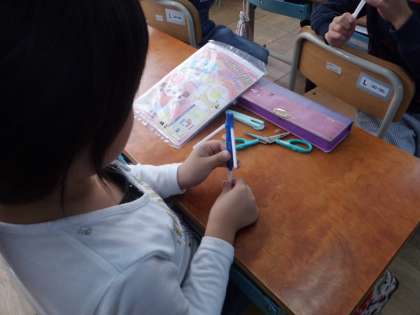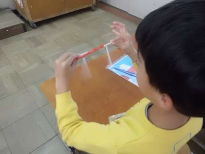 図工の「ストローでこんにちは」で,ストローを使って動くしくみを作りました。でき上がると,うれしそうに動かして何を作るかイメージを広げていました。