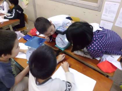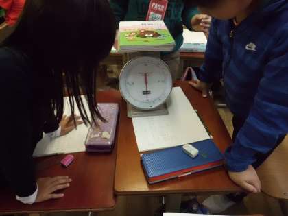 算数科の授業で,はかりを使い,身のまわりにあるものの重さを予想し,実際にはかりました。軽いと予想したものが重かったり,重いと予想したものが軽かったりとたくさんの発見がありました。子どもたちは次々と重さに興味をもって学習することができました。