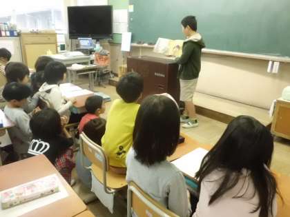 11月のどんぐり読書月間の取り組みで,図書委員の子ども達が6日の月曜日から各教室に行って読み聞かせをしてくれています。2年生の子ども達も,楽しく聞いています。