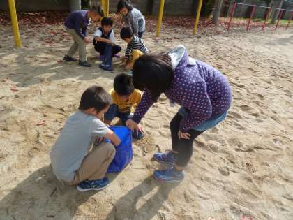 算数の学習で1kgの重さを体感しました。実際に砂場の砂を袋に入れて1kgをはかりました。子どもたちは「思ったより軽い!」「砂が思ったより少なかった!」などと言った感想をもっていました。1kgはこのくらいという感覚を持ってくれたらうれしいです。
