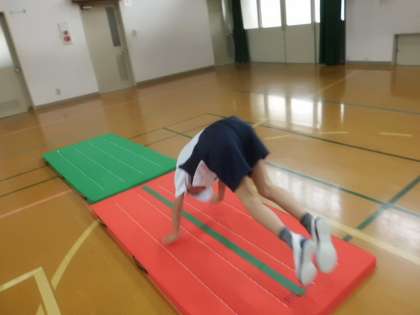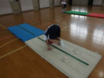 体育のマット遊びで,跳びこみ前転にも挑戦しています。みんな,はりきって練習しています。
