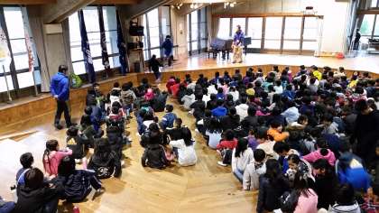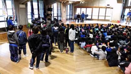 4校合同の朝の集いです。児童代表が,他の学校のお友達に学校紹介をしました。