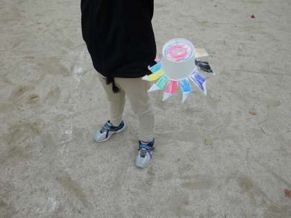 図工で,紙コップ,糸,クリップを使って風をうけてクルクル回るおもちゃを作りました。子ども達は自分で作ったものがクルクル回ることに喜びを感じて,運動場でもたくさん走りまわっていました。また,さらに家でも作ったりかざりつけを工夫したりして楽しんでいってほしいです。