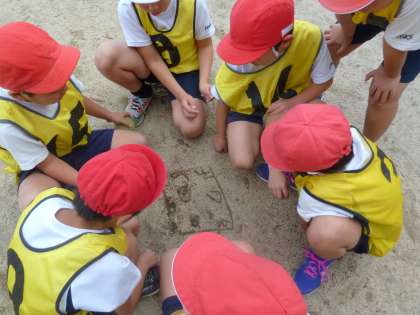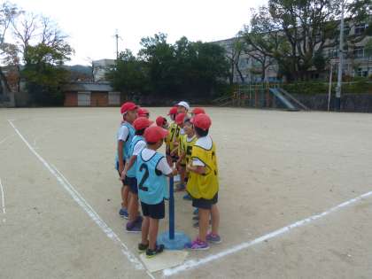 今体育では「ハンドベースボール」の学習をしています。子どもたち同士ルールを教えあいながら,協力し合ってボールをつないでいます。テキパキ準備をして,チームごとにキャッチボールをしています。作戦会議をしているチームもあり,やる気あふれる子どもたちです。