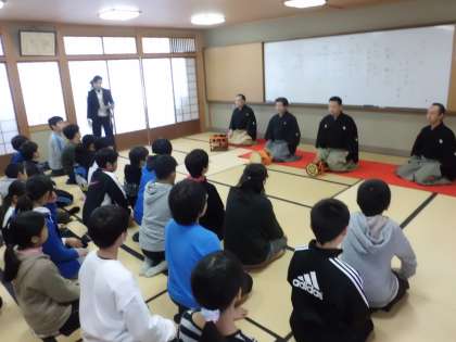 今日は「ようこそアーティスト」ということで,能楽囃子(はやし)方のみなさんに来ていただき,能で使われる楽器を教えていただきました。見るだけでなく実際に使わせてもらうことで,難しさや楽しさを学ぶことが出来たと思います。これからも能に親しんで,学んでいきましょう。