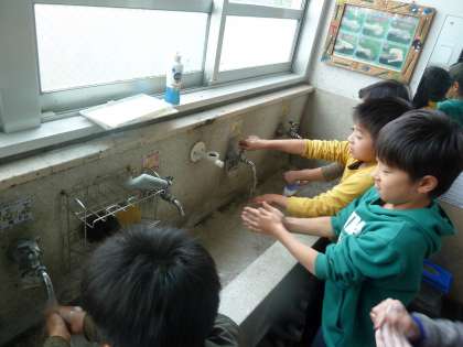 初めての保健の学習をしました。脱脂綿を濡らしたもので手のひらの隅々までこすってみると,脱脂綿が黒くなっている子どもがいました。普段しっかりしているはずの手洗いではあまり汚れがとれていないことに気付くことができました。そこから,どのようにして洗えば汚れがとれるのか学習した後,実際にその洗い方で洗ってみました。これからも健康のためにしっかりと手洗いをしてほしいと思います。