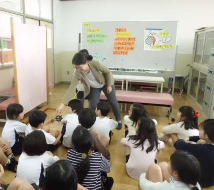 身体計測をしました。その時に,三好先生から「インフルエンザから体を守る」というテーマで,守り方を教えてもらいました。その後に,立ったまま靴下を脱いで履く練習をしました。身体計測では,どの子も背がのびていました。