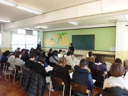 2月14日(水)午後2時より平成30年度入学予定のお子さんと保護者を対象に半日入学・入学説明会を行いました。入学予定のお子さんは本校の1年生の教室でお話を聞いたり,絵を描いたりと約1時間学校生活を体験しました。その間,保護者の方には別室で,本校職員より入学に当たり準備していただきたい物などについてお話させていただきました。14日の給食献立も見ていただきました。