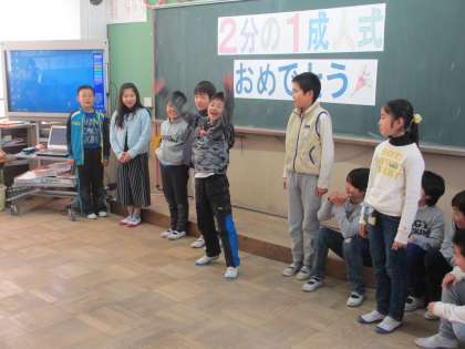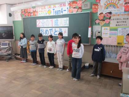 「2分の1成人式」をしました。授業参観ということもあり,たくさんの保護者の皆様に見ていただくことができました。生まれた頃から現在に至るまでの様子を群読劇と歌で表現しました。練習から本番に至るまで,みんなで協力してとても楽しく取り組むことができました。今後も様々なことに積極的に挑戦してがんばってほしいと思います。