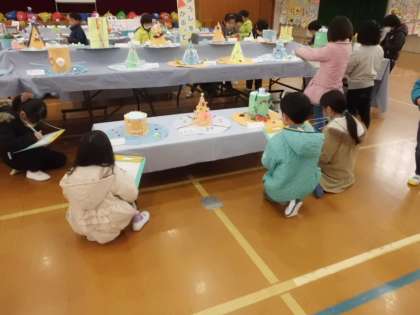 体育館で開かれている作品展を見に行き,作品を鑑賞しました。「この作品,上手だな。」「どうやって作っているのかな。」「すごいな。」「お兄ちゃんの作品や。」などどの学年の作品も楽しそうにみていました。学年が上がるにつれて,このような作品を作っていくことがイメージできました。