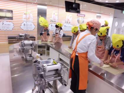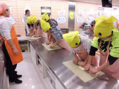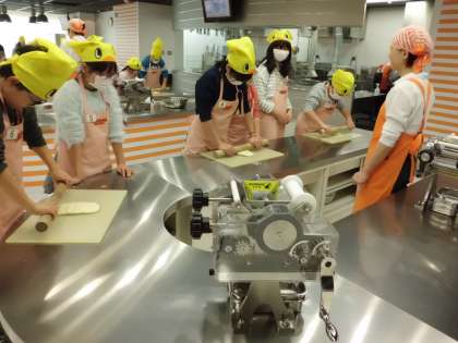 生地を麺棒でのばしました。初めは一人ずつ順番にのばしてましたが,力のいる作業なので,最後は二人で協力してのばしていました。