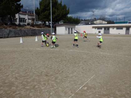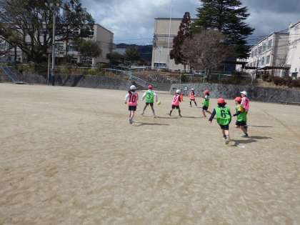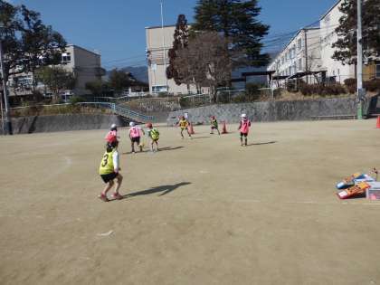 体育でボールけりゲームをしています。どの子もボールを追いかけてけってがんばっています。味方に声をかけ合ってパスしたり応援したりと1年生の時よりも上手になっています。