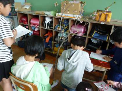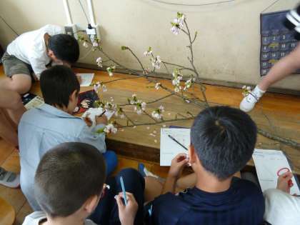 理科の授業で桜の観察を行いました。今年の桜は早く散ってしまったので,始業式に使った桜を観察しました。実際に花びらを採って花びらの中の様子を見たり,木の枝を触ってみたりしました。子どもたちは普段遠くから見るだけではわからないことにも気づき,書き込んでいました。