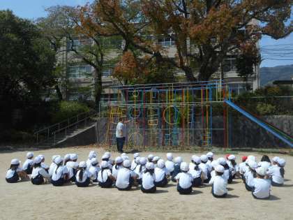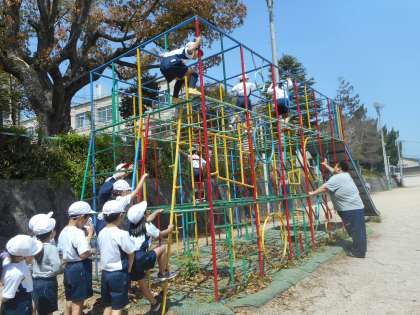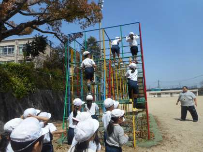 体育で「ゆうぐであそぼう」の学習をしました。いよいよ2年生は,総合遊具の2階から3階へのデビューです。全員安全に気をつけてしっかりと教えたことやきまりを守ってがんばっていました。これからも安全に気をつけてどんどん遊具を使って遊んでほしいと思います。