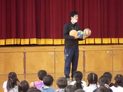 4月16日の朝会の後,谷詰先生からボールの使い方について説明がありました。また河村先生から学校のきまりについて話がありました。