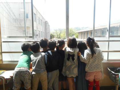 2年生になり,教室が2階になりました。窓から見える景色に,うっとり見とれている子どもたち。「キーキー」という,きれいな鳥の声も聞こえてきて,「あっ!白い鳥がいる!」と楽しそうに話をしていました。自然豊かな大原野小学校です。