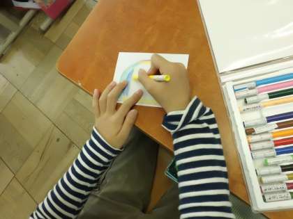 1年生を迎える会に向けてこいのぼりのうろこを作っています。子どもたちの個性が出ているたくさんのうろこは少しずつ大きなこいのぼりに貼られ,とても色鮮やかできれいです。まだ,完成はしていませんが,その日が来るのがとても楽しみです。