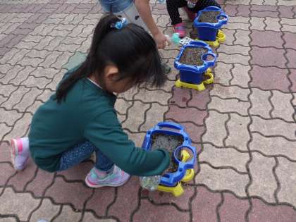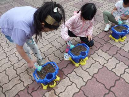 8日(火)に,生活の学習であさがおの種を植えました。植木鉢にそっと土を入れ,肥料を混ぜて水をかけ,さらに植木鉢の上の方まで土を入れて,準備をしました。いよいよ土に穴をあけ,種を入れてそっと土をかぶせて水をたっぷりかけました。どの子も,芽が出るのを楽しみにしています。