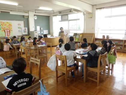 学校司書の遠山先生から,図書館の使い方の説明をしてもらいました。図書館に初めて入り,とても楽しそうでした。一生懸命話を聞き,読書ノートに記入して学習しました。