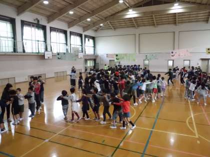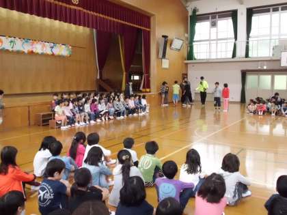 5月10日(木曜日)に全校児童で1年生を迎える会をしました。1年生は入学して1ヶ月が過ぎ,随分学校生活に慣れてきました。最初に6年生と一緒に入場し,みんなの前でしっかり自分の名前を言いました。その後,「○×クイズ」や「貨物列車」をして楽しみました。「貨物列車」では,最後までジャンケンに勝った3年生を先頭に,大原野小学校全員がつながりました。体育館には各クラスで作った鯉のぼりが入学を祝っていました。