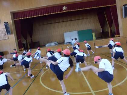3年生は,体育の時間にリズムダンスをしています。前の時間に覚えた動きをもう一度練習し,次に新しい動きを覚えました。音楽に合わせて踊ることはとても難しいですが,子どもたちは,一つひとつの動きを大切に頑張りました。