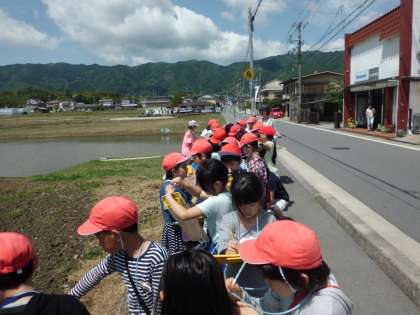 交番と郵便局を通り過ぎ,しばらく歩くと田や畑を見ることができました。大原野には田や畑が多く,いろいろな野菜が育てられていました。子どもたちは,地図記号を丁寧に地図に記すことができました。