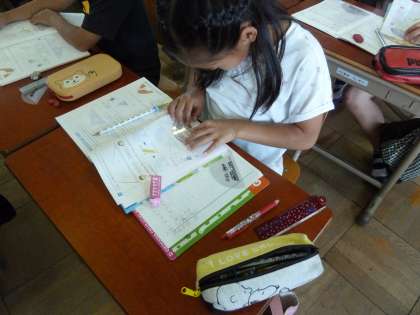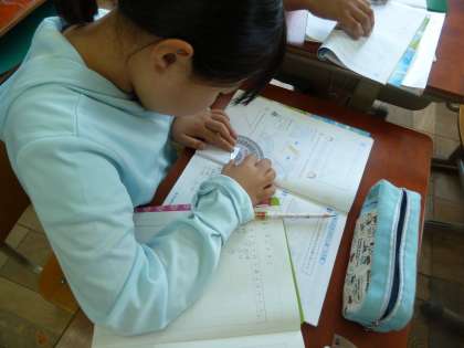 今算数では『角とその大きさ』を学習しています。初めて分度器を使い,角度の測り方を何度も練習し,慣れていっているところです。辺の短い角や,いつもと反対向きの角の測り方を学びました。