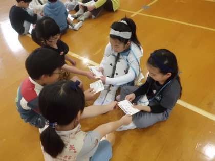 17日(木)に2年生に案内してもらって学校探検をします。学校探検にむけて,1・2年生のグループが仲良くなれるように,わくわく集会を行いました。2年生が準備してくれ,いっしょに歌やダンスを楽しみました。グループの2年生から,あさがおの種が入った手紙とワッペンをもらい大喜びでした。