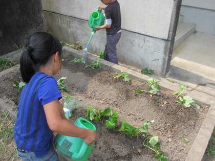 2年生の花壇にサツマイモの苗を植えました。毎日,水やりをして,たくさんのサツマイモが育つことを楽しみにしています。