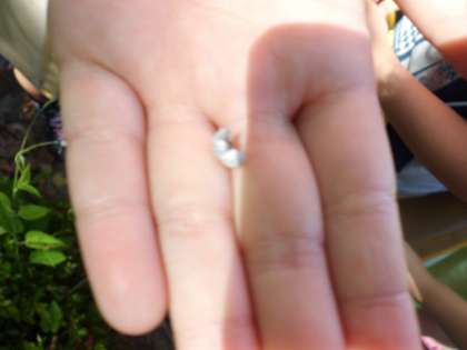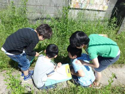 「先生!テントウ虫がいたよ。」「モンシロチョウが!」「クスノキがあるよ。」「これは柿の木。」「ダンゴムシの赤ちゃん発見したよ!」と喜びの声がたくさん。