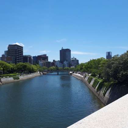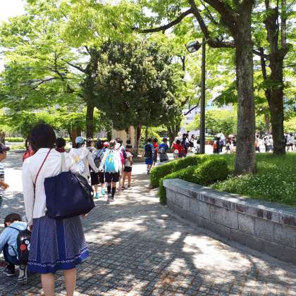 平和記念公園に到着しました。みんなで作った折り鶴と共に原爆の子の像の前で,平和の誓いの式をします。